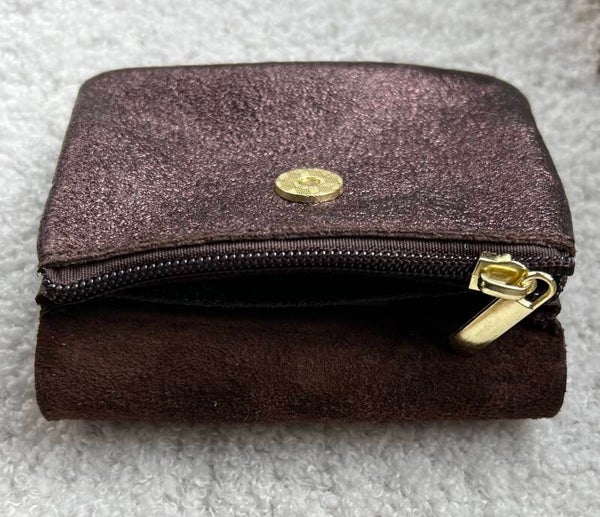 Dimensions : 10,5 x 8 cm Matière : cuir de vachette, bouton en laiton aimanté, 3 compartiments, fermeture éclair.