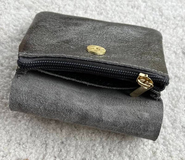 Dimensions : 10,5 x 8 cm Matière : cuir de vachette, bouton en laiton aimanté, 3 compartiments, fermeture éclair
